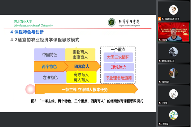 此次竞赛经教师个人申报、各教学单位遴选,共推荐5位教师参加继续教育赛道比赛,比赛过程规范有序,各参赛教师在说课、教学演示环节,从自己学科专业特点出发,深入挖掘课程蕴含的思政元素,把思想政治教育有机融入到课堂教学中,展示了各具特色的教学设计和教学风采,赛后评审专家们对参赛教师现场表现进行了综合点评。最终经济管理学院刘家富老师获特等奖;动物科学技术学院胡国富老师、经济管理学院王积田老师、动物医学院高雪丽老师、水利与土木工程学院梁冬玲老师获一等奖;特等奖教师将代表我校参加黑龙江省高等学校第二届课程思政教学竞赛继续教育赛道比赛。