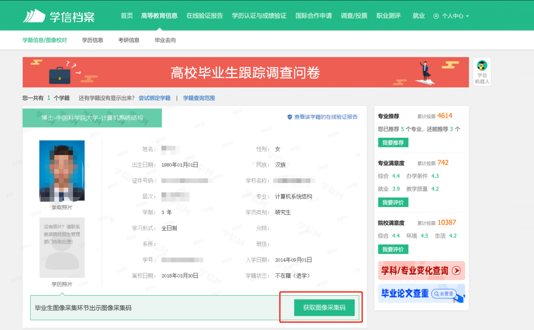 3. 学信网会陆续对上传后的学历照片和身份证照片及学生录取照片进行核对,如果图像差别较大,会导致采集的学历照片查验不通过,采集单位会联系学生本人更换照片,请学生予以配合。