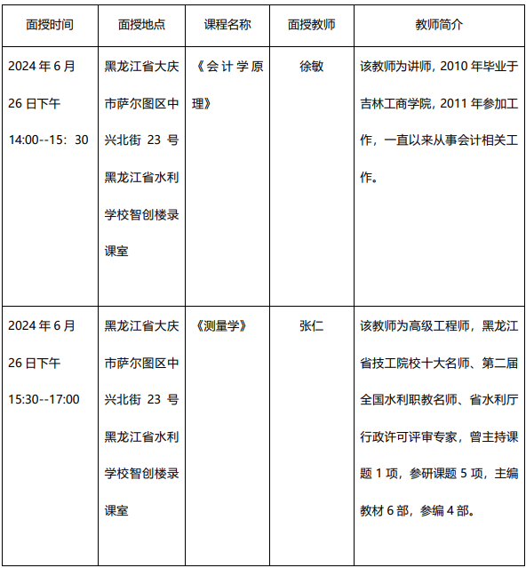根据学校教学工作安排,2024年6月26日黑龙江省水利学校将面向2024级会计学原理和测量学专业的函授学生开展线下面授教学活动,面授工作安排如下: