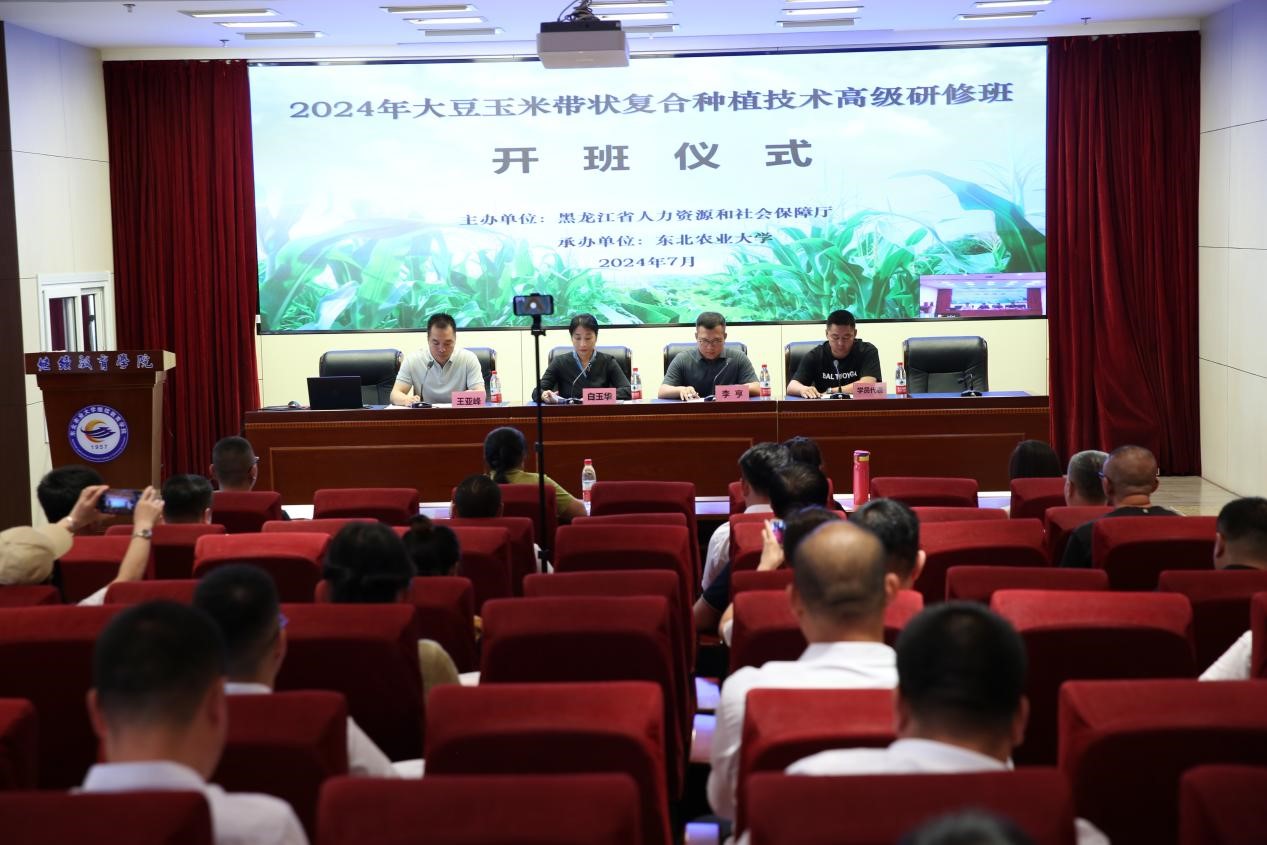 7月9日上午,由黑龙江省人力资源和社会保障厅主办、东北农业大学承办的“2024年大豆玉米带状复合种植技术高级研修班”开班仪式在继续教育学院七楼会议室举行。来自我省从事家庭农场经营者,农民合作社带头人,农村创业创新带头人,农业企业、农业新型经营主体,农业推广技术人员、涉农院校专业技术与政府相关部门管理人员等150余名学员通过线上、线下方式参加了开班仪式。东北农业大学继续教育学院副院长白玉华,教务处非学历教育管理科科长李亨出席开班仪式。开班仪式由继续教育学院培训科科长王亚峰主持。