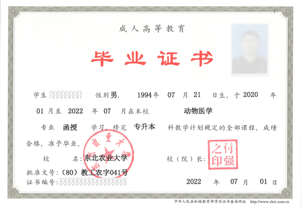 学历:学生在规定的学业年限内,完成教学计划规定的所有课程且成绩合格,达到毕业要求,由我校颁发教育部统一电子注册且国家承认学历的东北农业大学毕业证书(成人高等教育、毕业证书上学习形式以学信网学籍注册的学习形式一致)。