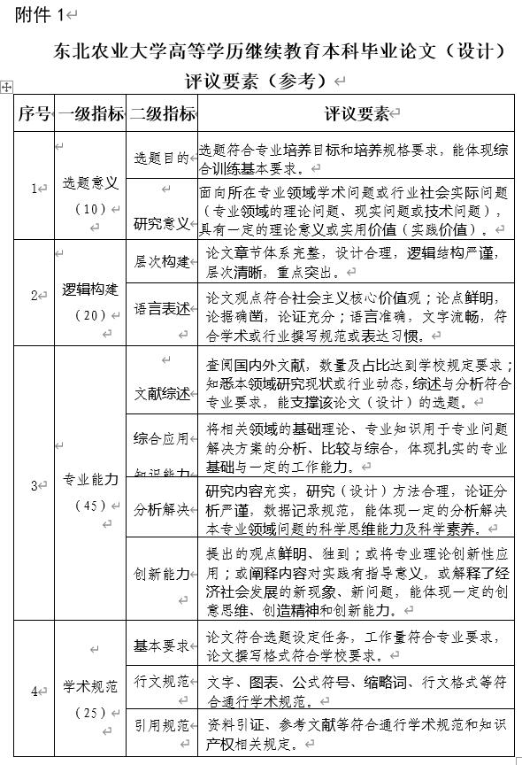 第二十一条 学院组织开展毕业论文评审工作,依据《东北农业大学高等学历继续教育本科毕业论文(设计)评议要素(参考)》中的选题意义、逻辑构建、专业能力和学术规范等要素指标进行评审。评审成绩占学生毕业论文成绩的50%。