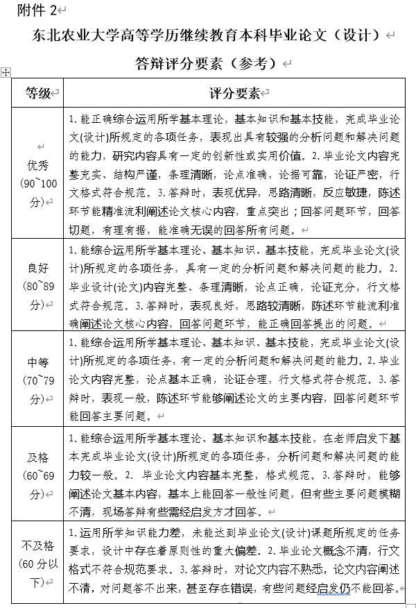 第二十三条 各教学学院、校外教学点和学习中心的学历继续教育毕业论文(设计)答辩委员会,依据《东北农业大学高等学历继续教育本科毕业论文(设计)答辩评分要素(参考)》,明确答辩要求和评分标准,在规定时间内完成答辩工作,做好答辩记录,并给出答辩成绩。答辩成绩占学生毕业论文成绩的40%。