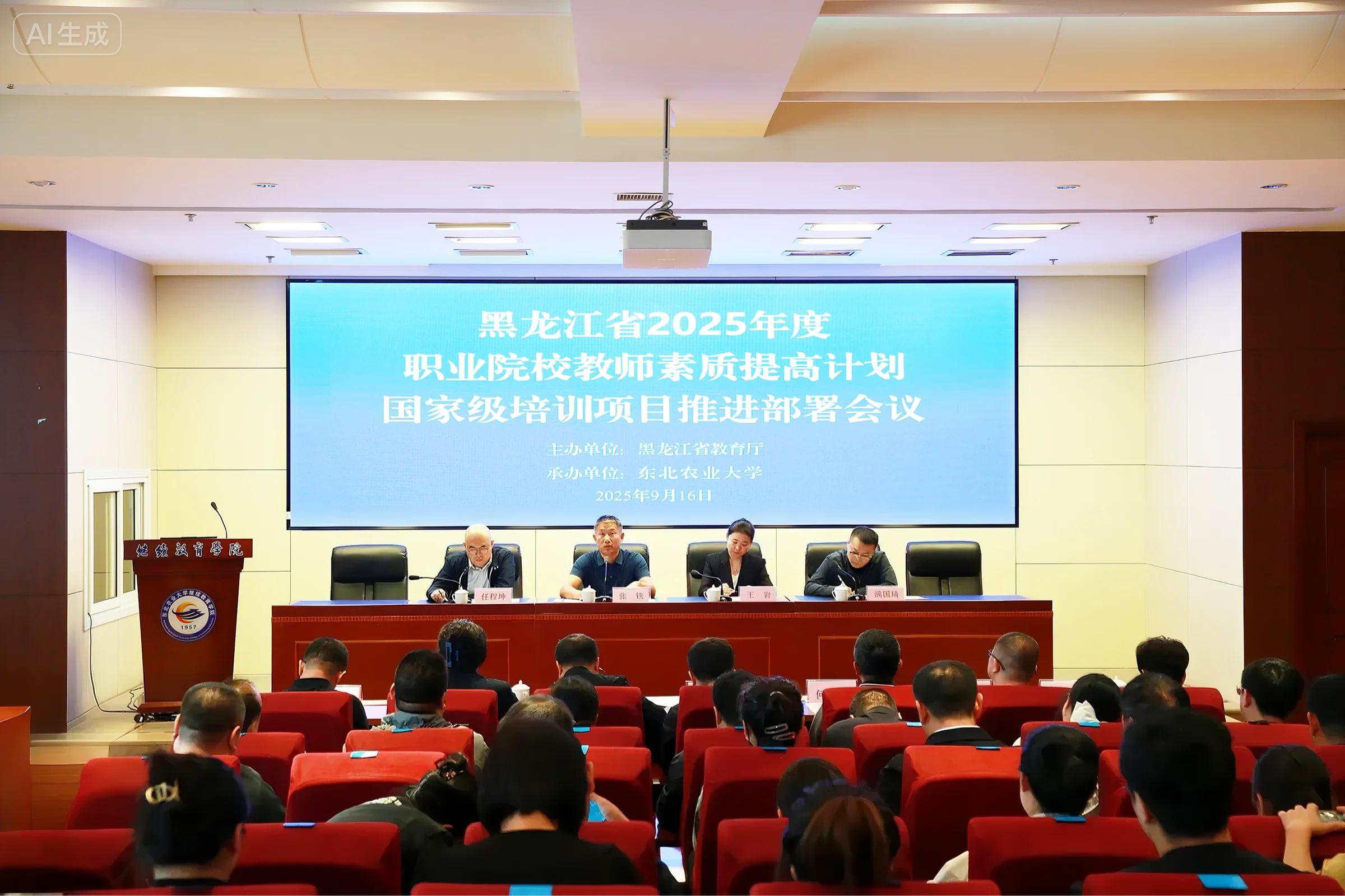 9月16日,黑龙江省2025年度职业院校教师素质提高计划国家级培训项目推进部署会在我校成功召开。本次会议由黑龙江省教育厅主办,东北农业大学承办。来自黑龙江省2025年各项目承训基地(机构)主管校领导、各市(地)教育局负责“职教国培”项目处(科)室负责人、在哈高等职业院校人事处(党委教师工作部)负责人、黑龙江省2025年各项目承训基地(机构)负责人、团队核心成员共计60余人参加会议。黑龙江省教育厅教师工作处处长王岩、二级调研员满国琦、黑龙江省职业院校教师素质提高计划项目办主任任程坤出席会议。会议由我校继续教育学院党委书记张铁主持。