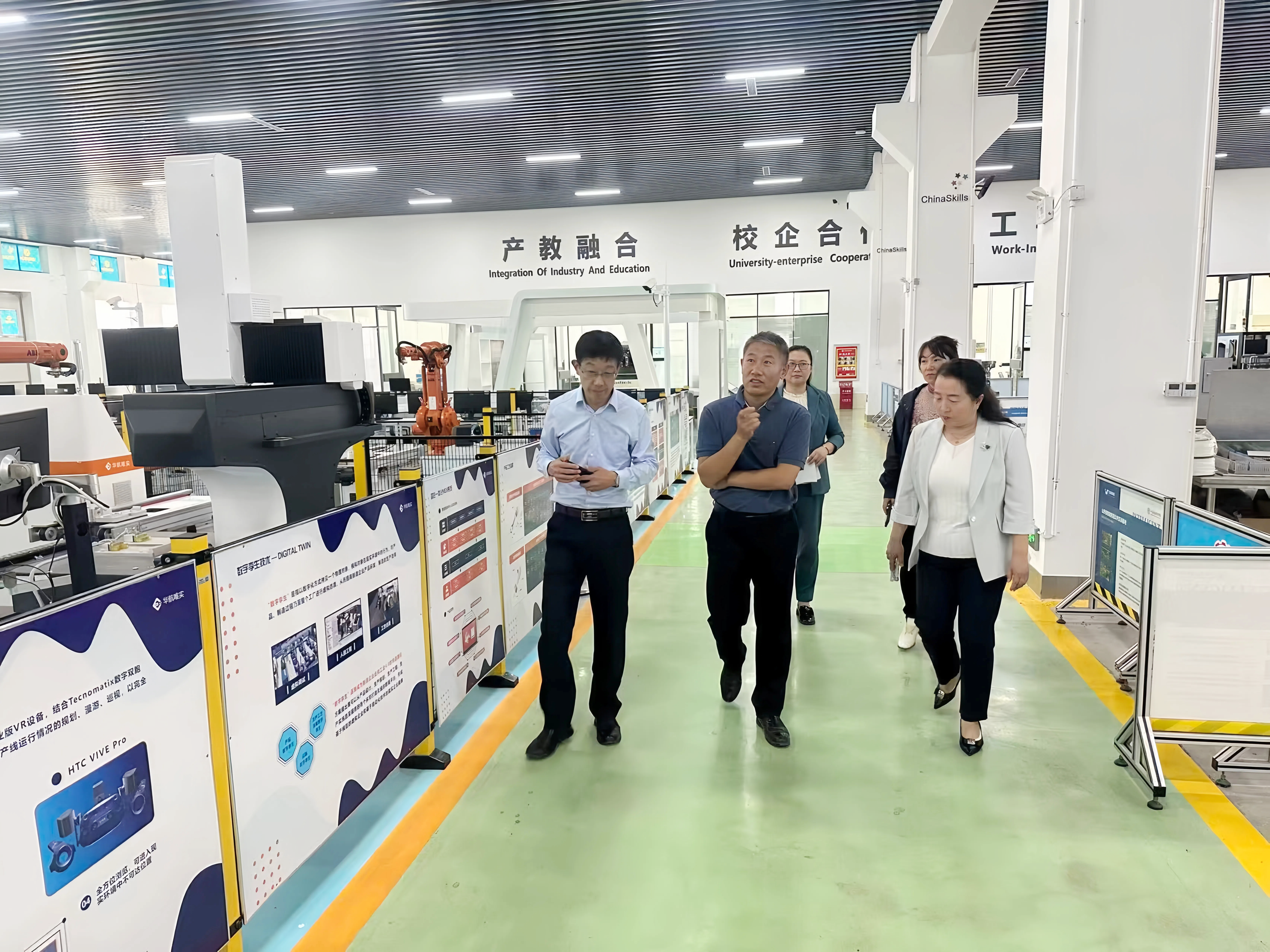 徐晓雁在座谈中对山东科技职业学院的学院历史、办学理念、特色专业和实训基地等总体情况进行了介绍。杨广霞陪同张铁一行参观了学院服装智能制造、虚拟仿真实训、智能控制与应用、工业互联网创新应用、智能制造协同创新和技术技能人才培训与鉴定等公共实训基地。