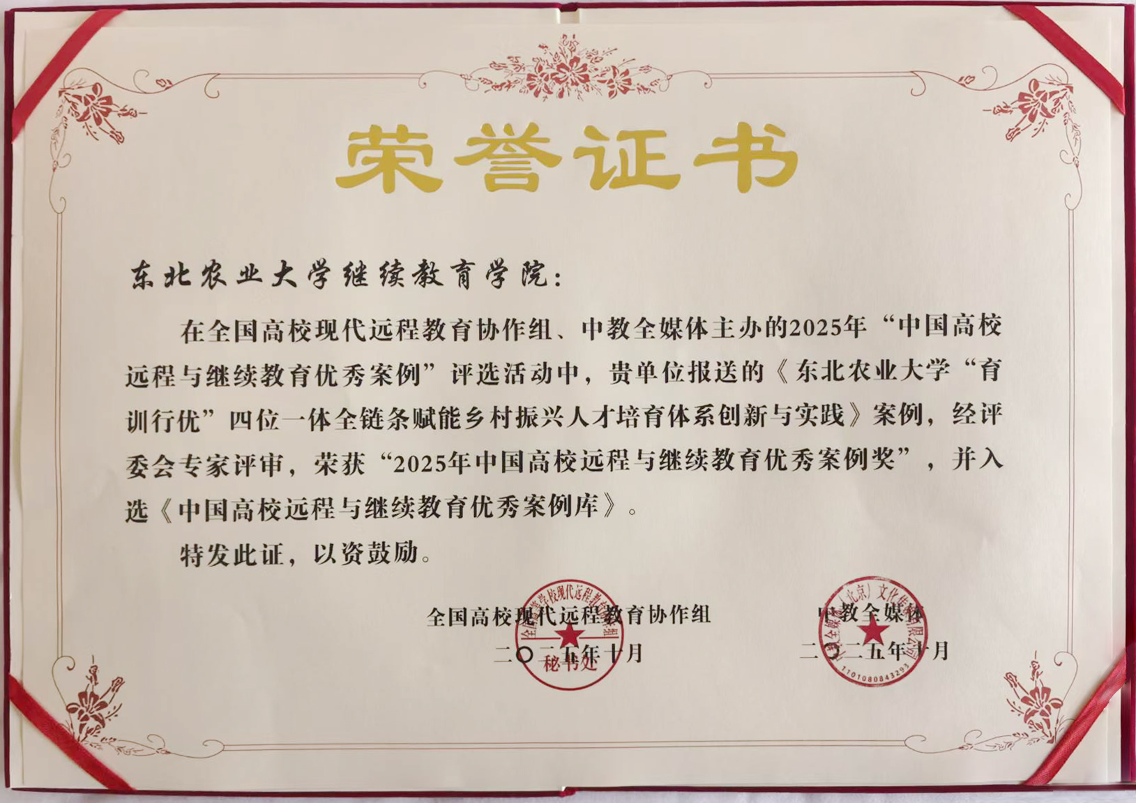 双奖殊荣,是里程碑,更是对服务国家教育强国战略的崭新期许。我院将以此为契机,继续秉承“艰苦奋斗,自强不息”的东农精神,恪守“博学笃行,明德亲民”的东农校训,高擎服务社会的旗帜,深化育人内涵,不断拓展社会服务领域,在全面推进乡村振兴、建设教育强国的伟大征程中持续发力,让优质教育资源惠及更多群体,让创新实践成果服务更广阔天地,为推进教育现代化、助力乡村全面振兴书写更加精彩的篇章。