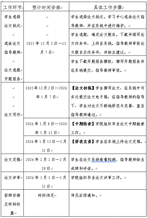 根据学院教学工作安排,按照《东北农业大学高等学历继续教育本科毕业论文(设计)管理办法(试行)》有关规定,现将2025年12月批次学生毕业论文写作具体工作安排通知如下: