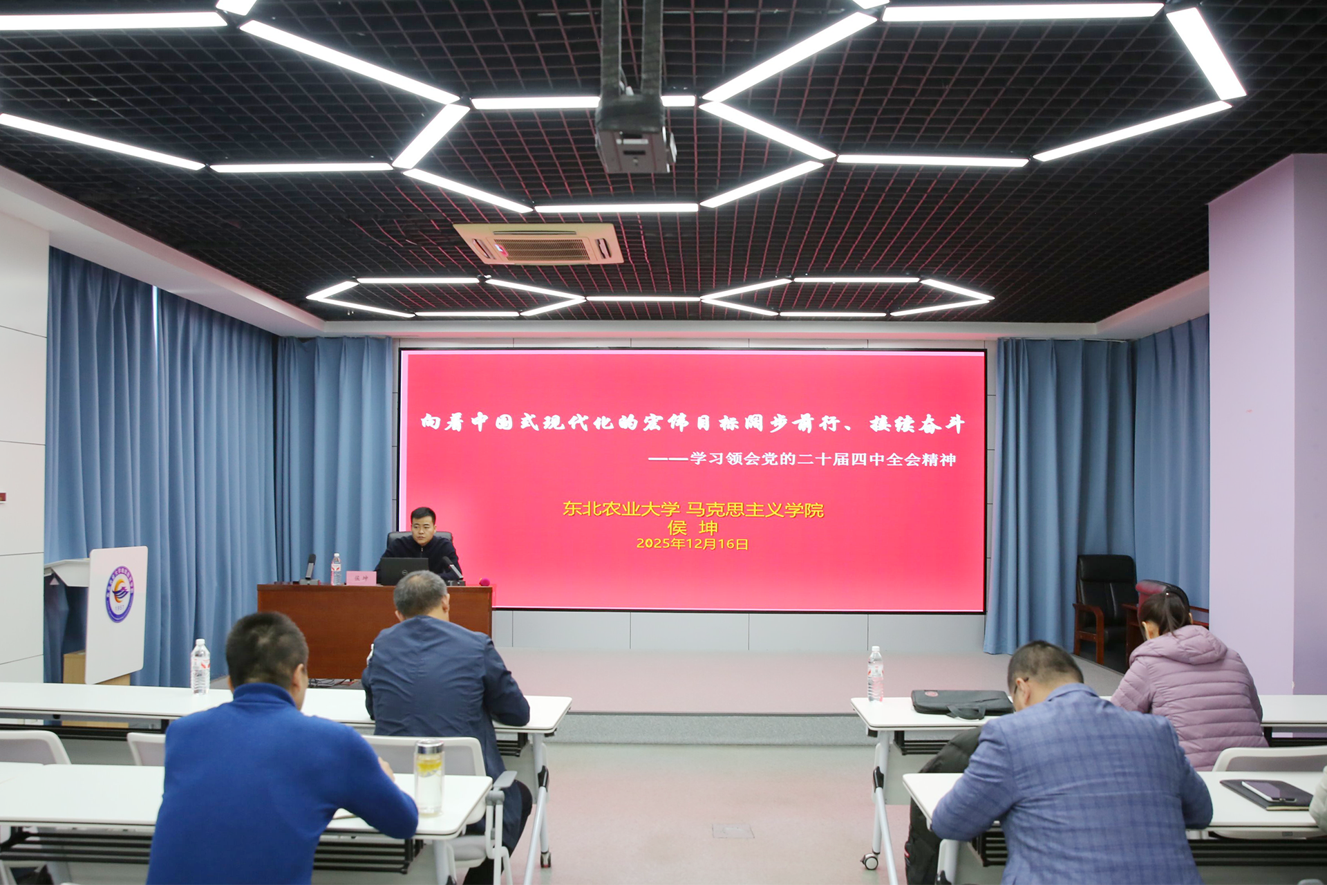 为深入学习贯彻党的二十届四中全会精神,以理论武装新成效推动继续教育高质量发展,锻造高素质专业化干部队伍,1216日,继续教育学院在705会议室举办学习贯彻党的二十届四中全会精神宣讲报告会,马克思主义学院副教授侯坤应邀作专题报告。全体党员领导干部、教职员工参加会议。会议由学院党委书记张铁主持。