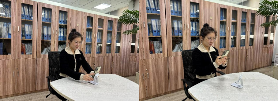 第二机位为安装“腾讯会议”的手机2,用于直播考生的考试全景画面。利用手机支架(建议考生提前准备好手机支架、三脚架或其他物品进行固定),横屏架设在考生侧前方1.5-2米处,摆放高度1.2-1.5米,与考试位置成45度角。监控设备架设好以后,开启摄像头,查看监控效果、调试监控角度。考生第二机位监控视频画面应确保第一机位考生手机屏幕、考生全身、桌面和大部分考试环境可见。确保考试区域光线均匀充足,避免监控画面过暗或过亮,导致监控效果不佳被判定为违纪,如图3。