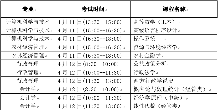 计算机科学与技术、会计学、行政管理、农林经济管理专业本科二学历层次校考课程考试科目及时间: